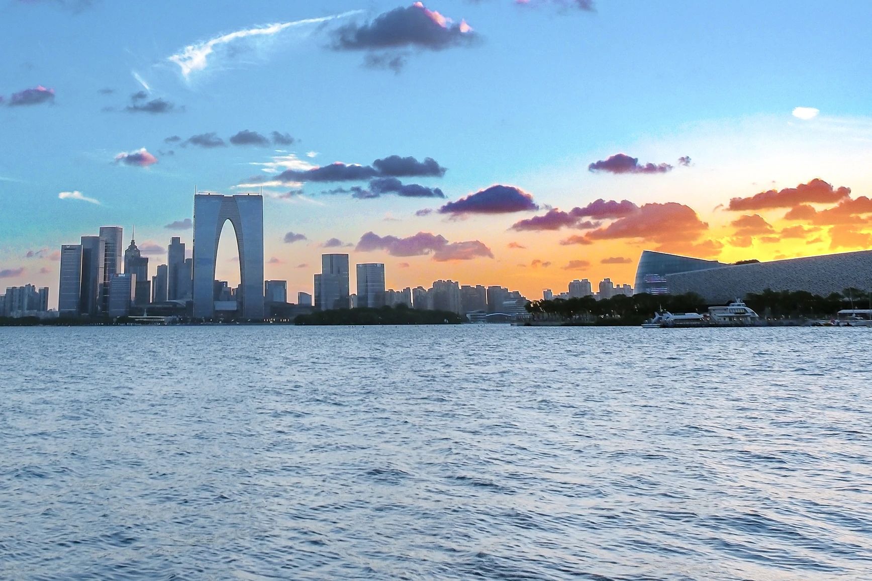 一條蘇州大道由古城向東跨越金雞湖,是貫穿園區東西方向的交通動脈,在這條中軸線上,眾多金融大廈傲然挺立,豐富著城市“天際線”。