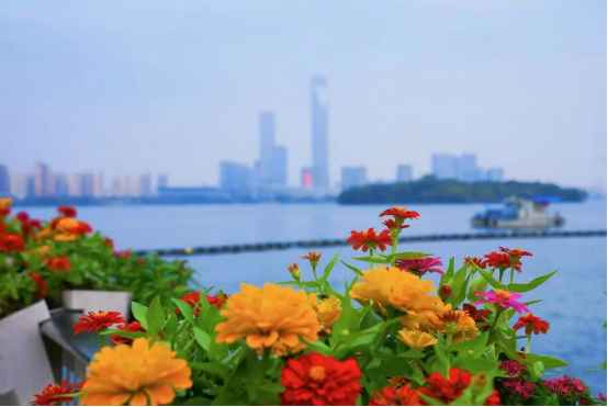 待到重陽日,還來就菊花。又是一年重陽時,湖畔百日菊競相開放,在微涼的風里搖曳。湖面隨風泛起的漣漪,與菊香一同輕晃。