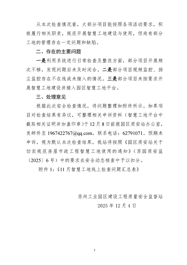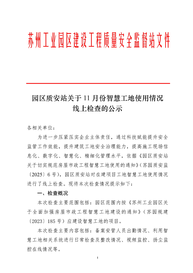 園區質安站關于11月份智慧工地使用情況線上檢查的公示