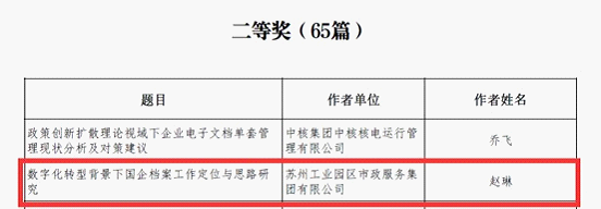 據(jù)悉,今年 3 月,中國檔案學(xué)會面向全國青年檔案工作者開始論文征集,并收到投稿論文 1191 篇。中國檔案學(xué)會組織專家對入選論文進(jìn)行了認(rèn)真評審,評出一等獎(jiǎng)?wù)?/span>文 50 篇、二等獎(jiǎng)論文 65 篇、三等獎(jiǎng)?wù)撐? 85 篇、入選論文 777 篇。近年來,園區(qū)檔案管理中心積極開展檔案科研工作,承擔(dān)多項(xiàng)國家、省、市課題,園區(qū)檔案工作者積極參與國家、省、市檔案學(xué)術(shù)交流,在《中國檔案》《檔案與建設(shè)》等核心期刊發(fā)表論文 10 余篇,在宣傳園區(qū)檔案工作,推動(dòng)園區(qū)及蘇州檔案事業(yè)高質(zhì)量發(fā)展上做出積極貢獻(xiàn)。
