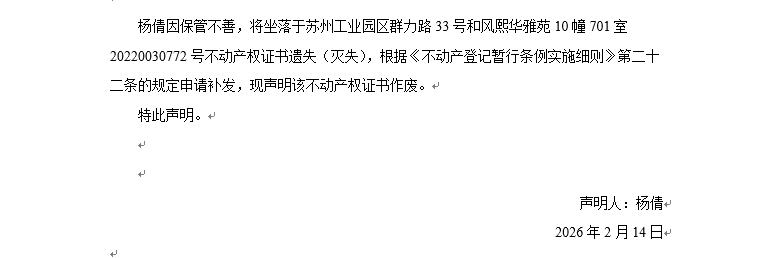 關(guān)于蘇州工業(yè)園區(qū)群力路33號和風熙華雅苑10幢701室20220030772號不動產(chǎn)權(quán)證書遺失聲明