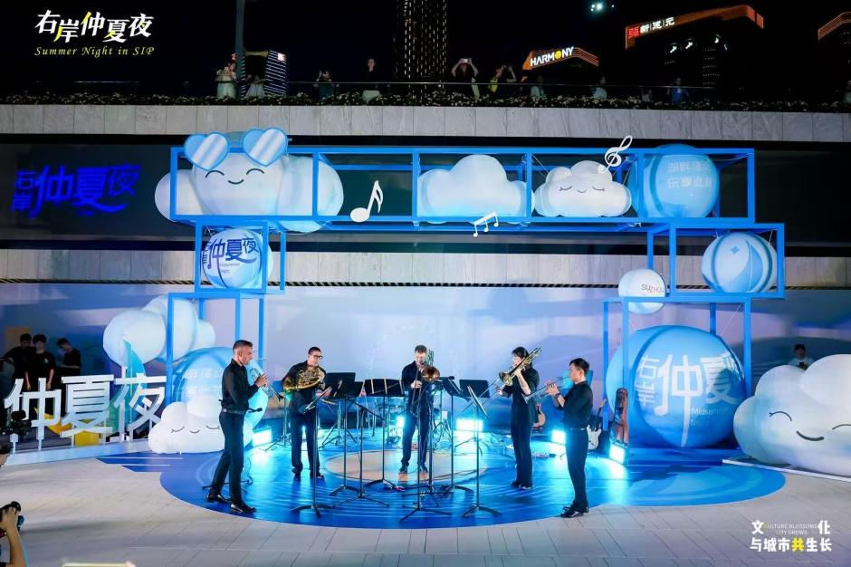 7月5日晚,金雞湖右岸客廳下沉廣場燈光璀璨,晚風習習,由園區打造的“右岸仲夏夜”首場演出在此活力上演。當晚的舞臺猶如一幅流動的藝術畫卷,銅管的國際和鳴、少年舞團的朝氣蓬勃、年輕樂隊的真摯表達、搖擺舞者的跨界活力——四個團隊,四種截然不同的藝術語言,打破了傳統舞臺的邊界,在開闊的右岸空間里,共同譜寫出城市文化活力的交響樂章。