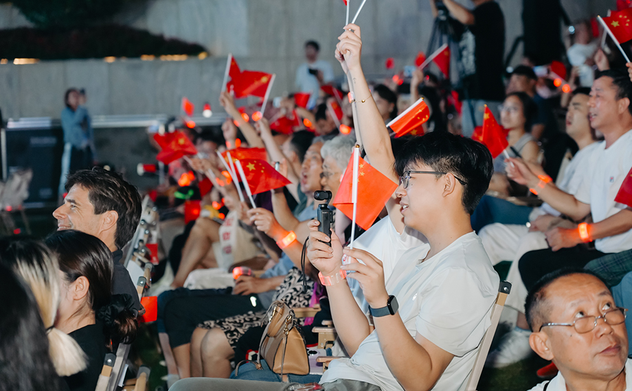 舞臺(tái)下,閃爍的熒光手環(huán)和舞動(dòng)的小紅旗則是觀眾們的熱烈應(yīng)答。市民張女士與孩子一起席地而坐,一起欣賞著樂團(tuán)的演奏,一邊在報(bào)幕的間隙為孩子解釋影片和樂曲的背景。她說:“有些電影我小時(shí)候看過,配樂非常經(jīng)典,在蘇交的演繹下更顯氣勢磅礴。在今天這個(gè)日子里,這一場音樂會(huì)既是藝術(shù)的盛宴,更是一次家國情懷的滋養(yǎng)。”
