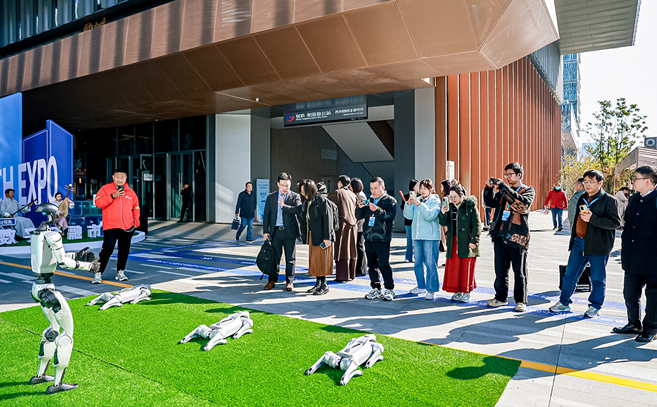 步入市集,婉轉(zhuǎn)柔美的蘇州評(píng)彈如清泉般流淌,瞬間將人帶入江南雅境。非遺展區(qū)內(nèi),蘇扇、緙絲、蘇繡等傳統(tǒng)工藝品在陽光下流轉(zhuǎn)生輝,市民紛紛駐足細(xì)賞、咨詢挑選。而在數(shù)字潮玩區(qū),科技感與未來感撲面而來,智能機(jī)器人揮舞雙臂與觀眾互動(dòng),憨態(tài)可掬的機(jī)器狗隨著指令完成轉(zhuǎn)圈、跳躍等高難度動(dòng)作,盡顯科技魅力,引得圍觀群眾陣陣喝彩。