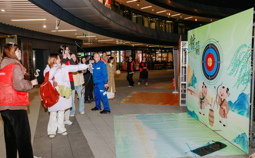作為市集“集券核心打卡點”,古風運動區的蹴鞠、射箭、投壺三大項目一經開放就人氣拉滿。活動以游園券作為通用兌換憑證,完成運動項目即可獲取,趣味與挑戰性拉滿。現場,紅色管家志愿者全程在線指導規則、示范動作,青年情侶、好友組隊摩拳擦掌踴躍參戰。蹴鞠場地里,大家瞄準目標全力開踢,命中瞬間的歡呼聲此起彼伏;射箭區域內,年輕人踮腳拉弓、精準瞄準靶心,專注模樣收獲一眾點贊;投壺項目前,參與者屏息凝神投放箭矢,每中一支都忍不住歡呼喝彩。不少青年組隊PK挑戰,在競技互動中拉近距離,一張張游園券不僅是實力的證明,更裝滿了歡樂時光。