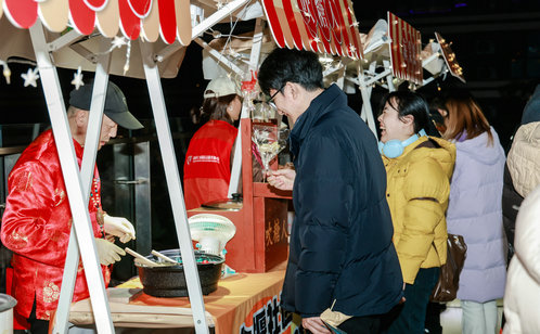 非遺美食區的煙火氣,妥妥拿捏了年輕人的味蕾。糖畫、冰糖葫蘆、海棠糕、吹糖人、赤豆小圓子五大傳統美食現場制作,香氣直撲鼻腔,吸引大批青年排隊兌換。糖畫攤主手持糖漿壺,手腕輕轉間,龍、鳳、小兔子等可愛造型躍然板上,年輕人圍在一旁舉著手機拍攝,拿到專屬糖畫立刻打卡分享;冰糖葫蘆攤位前,晶瑩糖衣裹著新鮮山楂,酸甜口感瞬間喚醒童年記憶,成為青年們的懷舊必選;海棠糕赤豆小圓子香撲鼻驅散夜晚涼意,暖心又暖胃。這些美食不僅滿足味蕾,更讓年輕人在品嘗中解鎖傳統風味的新潮打開方式,感受民俗文化的溫度。