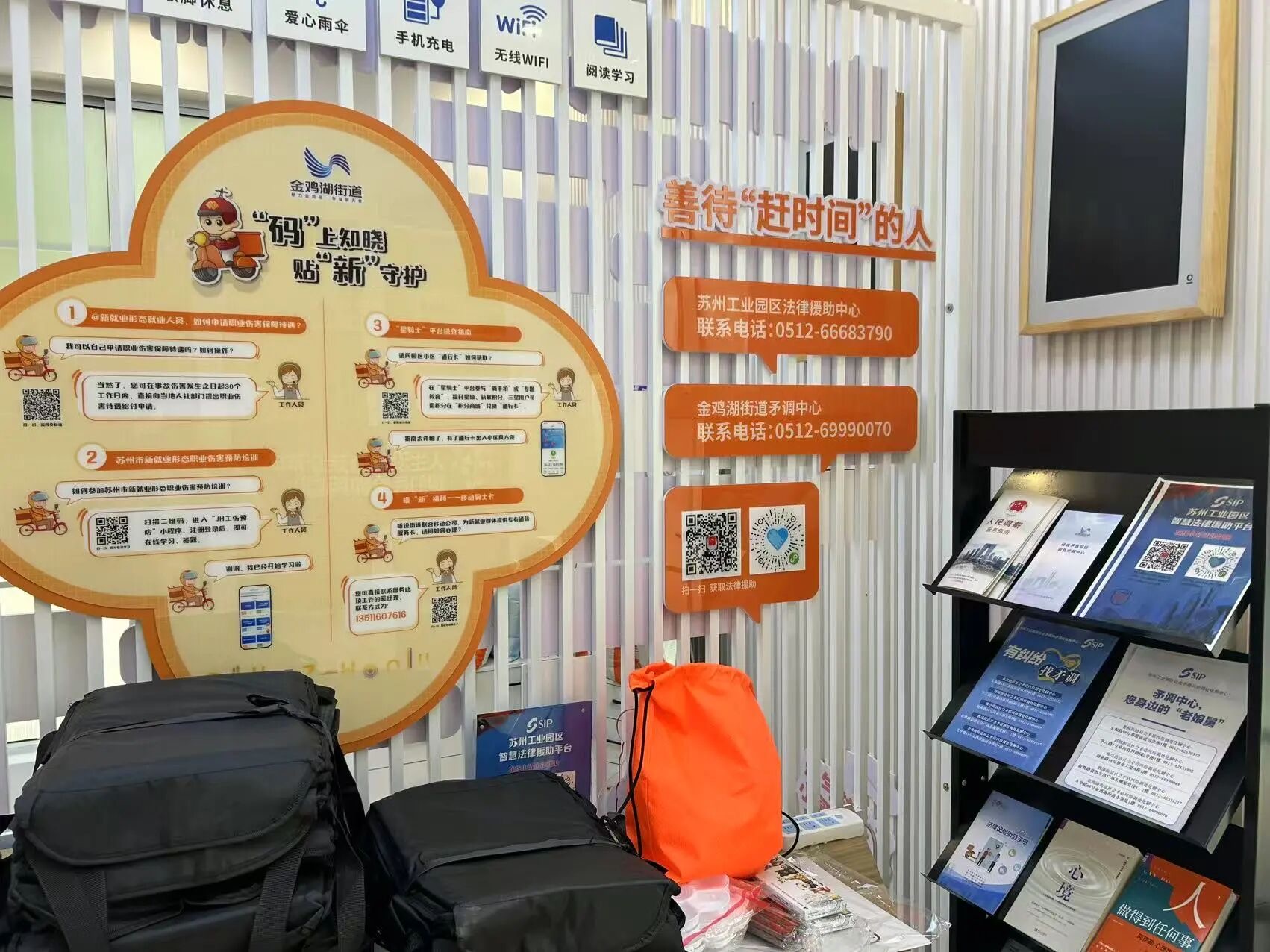 街道以需求為導向,推動普法從“單向”向“雙向”轉型。結合本年度農民工學法活動周、民法典宣傳月、安全生產月、暑期送清涼等重要節(jié)點,發(fā)動社區(qū)開展集中普法宣傳6批次,累計發(fā)放普法資料2000余份。通過微信群、公眾號等線上渠道,推送街道自制《就業(yè)形態(tài)勞動者權益保護普法手冊》、調解宣傳案例等實用信息,不斷豐富學法途徑。同時,鼓勵騎手化身“流動普法員”,通過在外賣箱上貼法治標語等形式,營造“流動”普法氛圍。此外,依托“城市客廳”及太平金融大廈“星”騎士加油站等暖“新”驛站增設“學法圖書角”,擺放《人民調解服務指南》《外賣行業(yè)法律風險防范手冊》等材料,供就業(yè)群體在工作休息之余隨手翻閱、隨時取用。