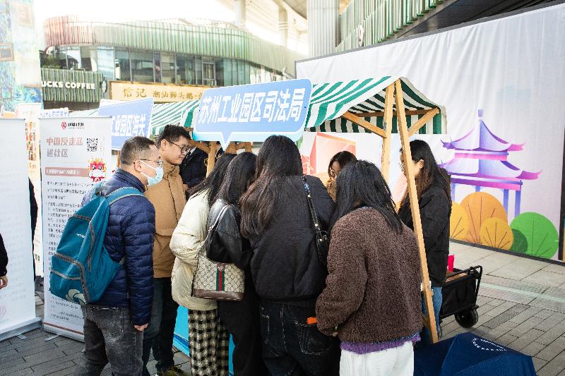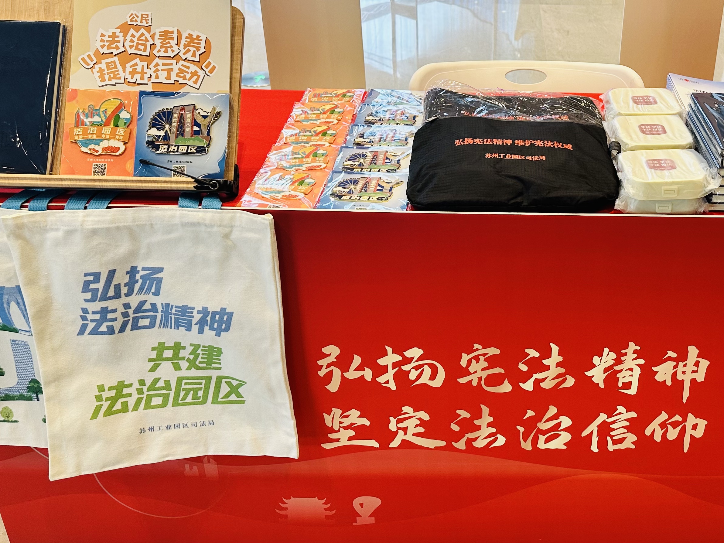 園區司法局聯合園區海關、金雞湖街道等在圓融時代廣場舉辦“憲在身邊 法潤金雞”法治市集,開啟憲法宣傳周系列活動序幕。現場設置10個普法攤位,吸引近230名群眾參與,通過憲法知識問答、法律咨詢解答、案例解讀、游戲互動等形式宣傳憲法、反詐防非、掃黑除惡等法律知識,并提供暖心熱飲和法治手作,實現“普法宣傳+惠民服務”零距離。積極響應市局“弘揚憲法精神,堅定法治信仰”主題活動,在獅山大劇院設置“法潤園區·聚力前行”普法攤位,提供的法治帆布袋、文創冰箱貼等法治產品備受歡迎。