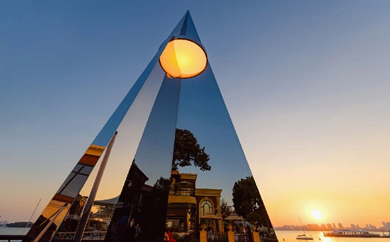 Named “Wen Jing”, one installation draws inspiration from a paper airplane and a rising rocket. Boasting polished stainless steel surfaces, it has previously toured cities like Shenzhen, Hangzhou and Shanghai, earning high acclaim. Reflecting the lake’s shimmering waves, clear skies and urban skyline, it creates an intriguing sense of spatial displacement.