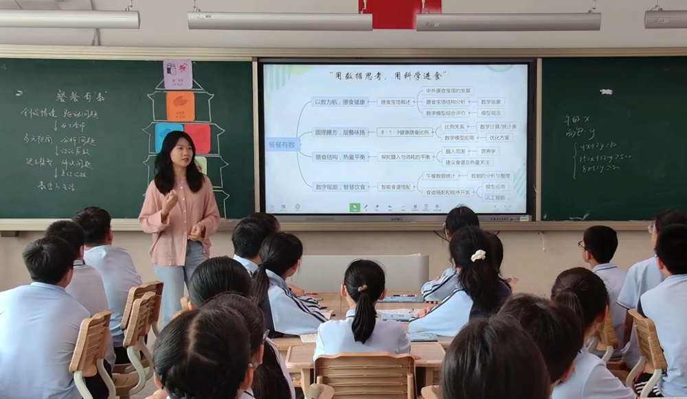 東沙湖實驗中學蔣余希老師在項目《餐餐有“數”》中,和學生一起圍繞膳食健康進行真實有趣的自主探究。通過數據的收集與整理、模型的建立與應用、人工智能的生成與優化,完成對于青少年膳食寶塔的認識、熱量均衡模型的匹配和營養食譜的設計。讓學生感悟飲食需要合理搭配比例,營養密度優先,最好的飲食是長期堅持、適合自己的飲食。